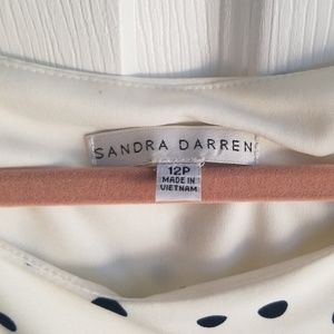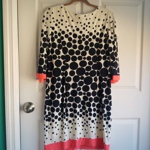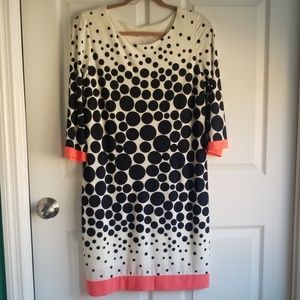 Pretty Black and cream pull over polka dot dress. Peach trim on sleeve and bottom of dress. Worn once, very clean, fits at knee.