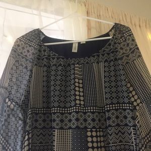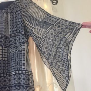 Navy Blue and White Patterned Dress with Sheer overlay Bell Sleeves