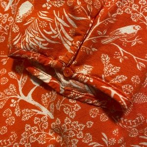 Orange with white detail of rabbits, birds, acorns and tress. Sleeves come to mid arm. No pet/No smoking home.
