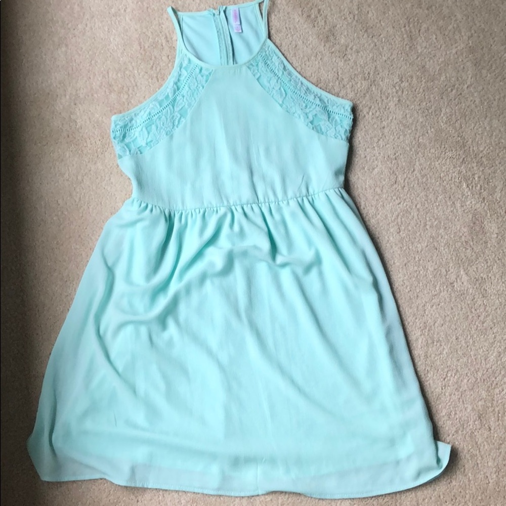 Really cute simple halter dress! Perfect for a more formal occasion. Never worn, took tags off thinking I’d wear it but never did. True to it’s size. Really pretty minty blue color.