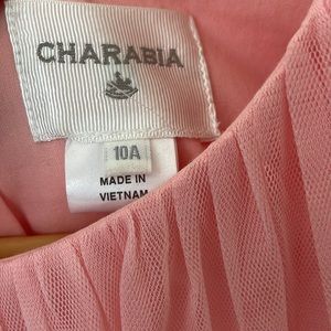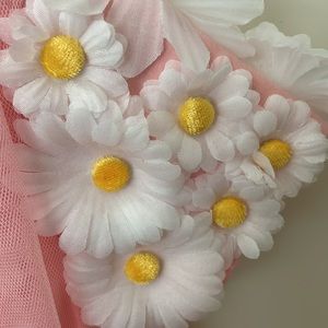Beautiful pink dress with tulle overlay. Sleeves covered in daisy flowers. Like new, only work once.
