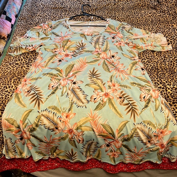 Spring dress with Hawaiian flowers. Hits me just above the knees. The sleeves are split.