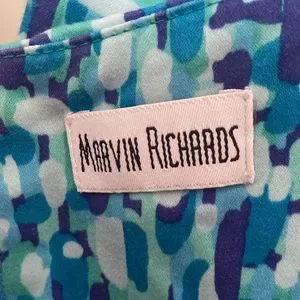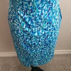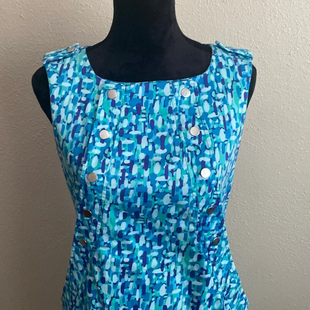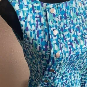 Multicolor print with silver buttons like general style. Front pockets, back zipper with small slit. Machine wash.