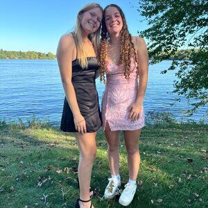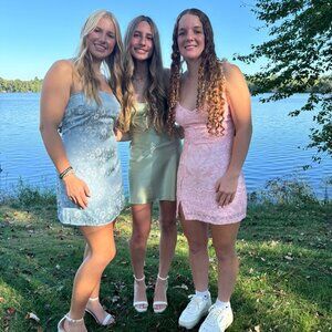 A blush pink mini dress features beautiful lace overlay with subtle sequins. Adjustable straps and very comfortable to move in.