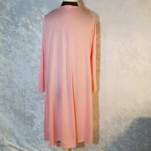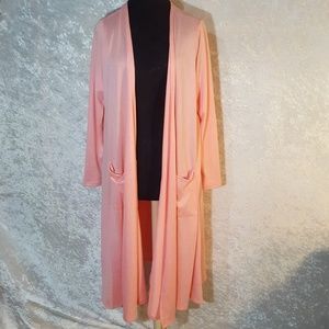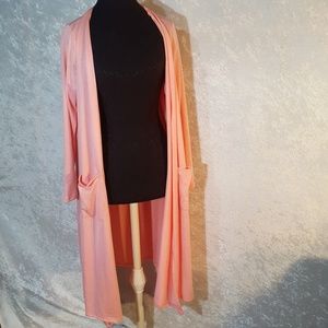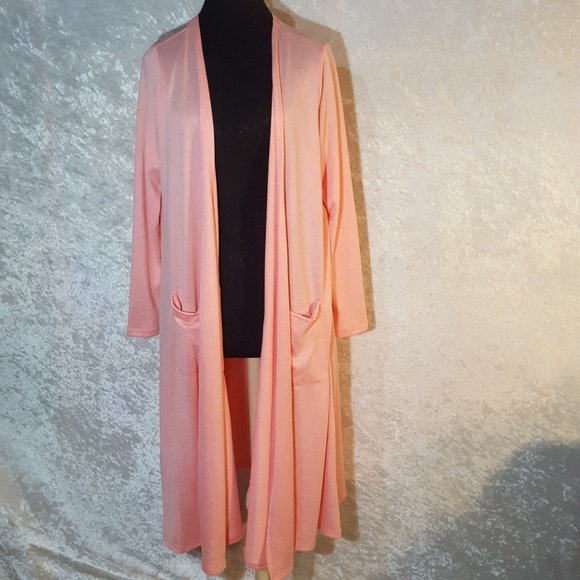 Size medium by LuLaRoe. Made in the USA. Pinkish salmon peach long duster with pockets. Lightweight and flowly with long sleeves. Pre owned condition not brand new but in great shape. Feel free to ask questions or request more photos. I do bundle discounts and accept offers. All of my $4 listings are free with a minimum $10 purchase just add to a bundle or submit an offer. Thanks for looking and happy poshing!