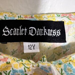 Yellow, pink, and blue microflorals on a cream background. Twee collar with a lace trim and ruffles on the shoulders. So adorable and perfect for spring!