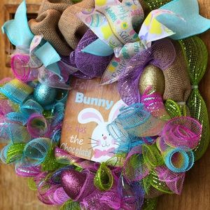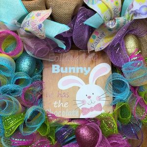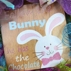 Greet your guest with this fun colorful hand-made deco mesh Easter wreath. This wreath measures 15 inches in diameter. It is constructed with bright beautiful spring hues. In the center there is a laser cut wood sign that says “Follow the bunny he has the chocolate”.