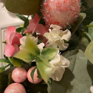 Spring Easter Wreath, 20” round, twig wreath with greenery, flowers, berries and eggs.