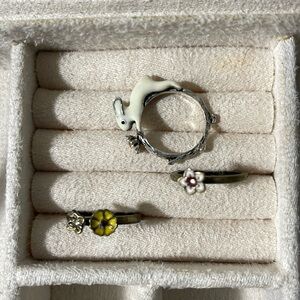 Stack set perfect for spring/summer! These items are women's enamel fashion rings featuring various nature and animal designs, similar to styles offered by brands like TAI Jewelry, GoodAfterNine, or Elegant floral ring set featuring vibrant yellow and pink accents with white rabbit in silver tone. Antique gold tones for the flower butterfly rings.