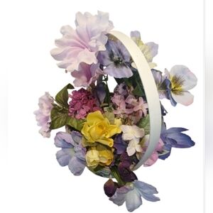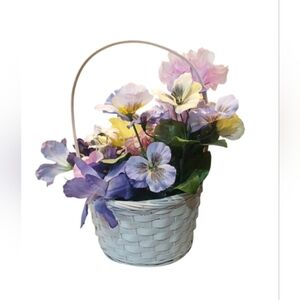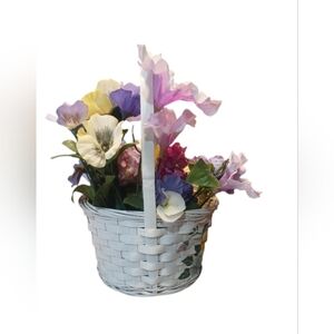 Brighten your space with this charming floral basket featuring vibrant yellow, purple, and pink accents. Perfect for adding a touch of nature to any room.