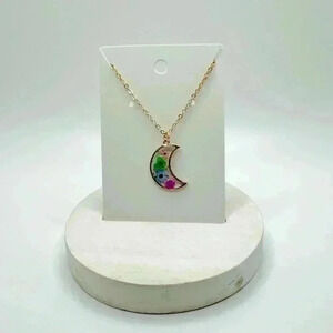 This crescent moon shaped pendant features a delicate colorful floral pattern crafted from glass