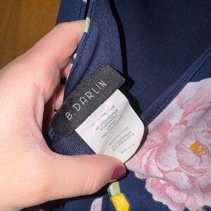 Navy Blue dress with floral print. Stretchy material. Worn once. Size 11/12. Zipper back, tie top, layered bottom