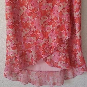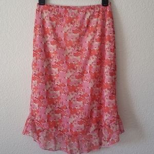 A variety of pinks with orange and white make this the perfect day skirt! Elastic waist. Small section of hem on inside liner coming undone as pictured, but not visible when worn.