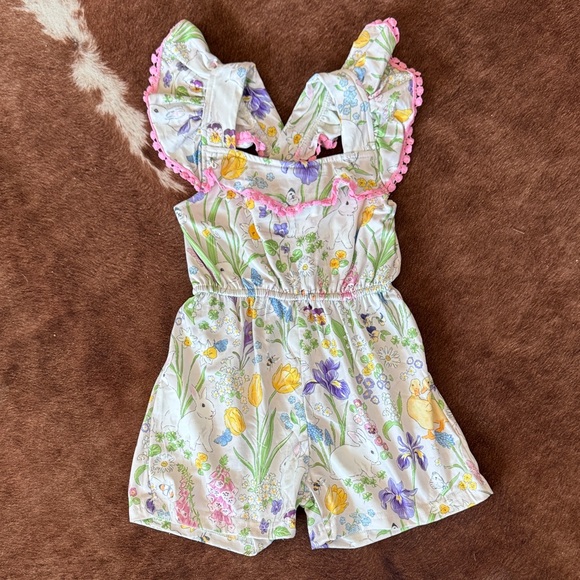 Adorable kids romper featuring a vibrant floral Spring print with ruffle crisscross straps. Perfect for Easter or playful days.
