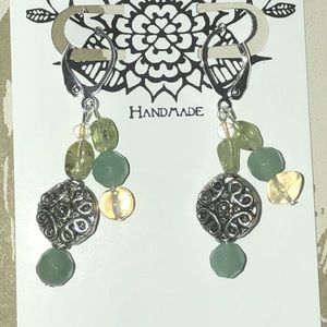 Hand cut peridot plays with citrine and faceted aventurine and swirly silver plated detail on comfy silver plated Leverback earwires. A subtle yellow and soft natural green way to add springtime to your earlobes. Artist’s signature gift packaging included.