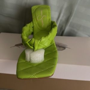 Lime green backless/strapless heel that has a heel about approximately 4 inches