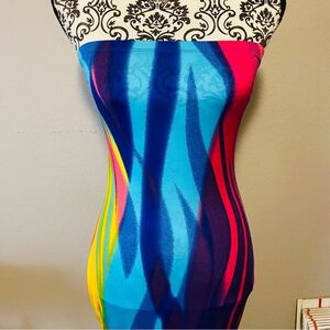Vibrant and stylish, this strapless maxi dress features a stunning multicolor design