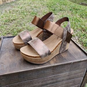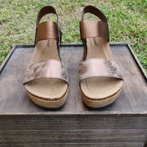 This high platform wedges is a perfect addition to any Spring wardrobe. They feature a double band design for optimal comfort and all day wear. They also have this slight bronze metallic sheen that is chic without being obnoxious.