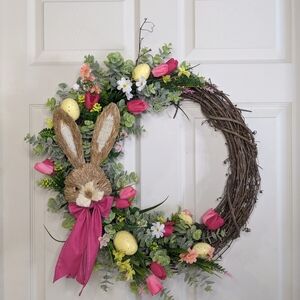 Celebrate the season with this delightful Easter Bunny Wreath. Featuring vibrant pink and yellow accents, it's perfect for adding a festive touch to your home decor.