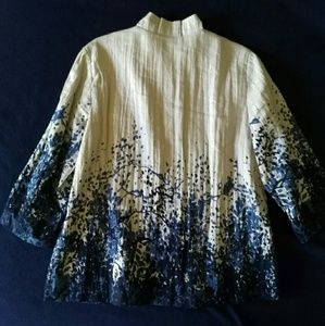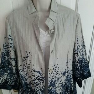 100 %Linen jacket with polyester lining. Falls just below the waist. Very light.