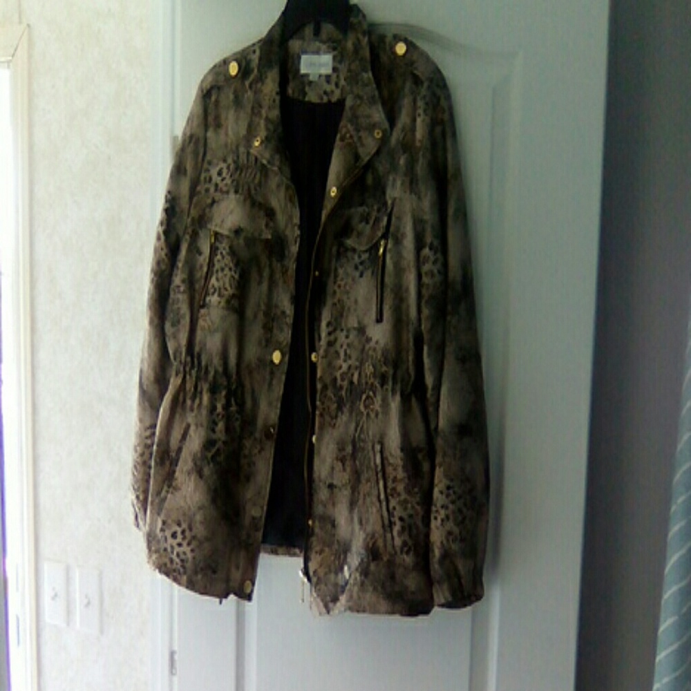 Erin London gold animal print jacket with zip and snap closure.