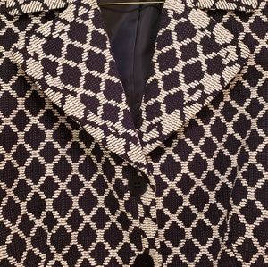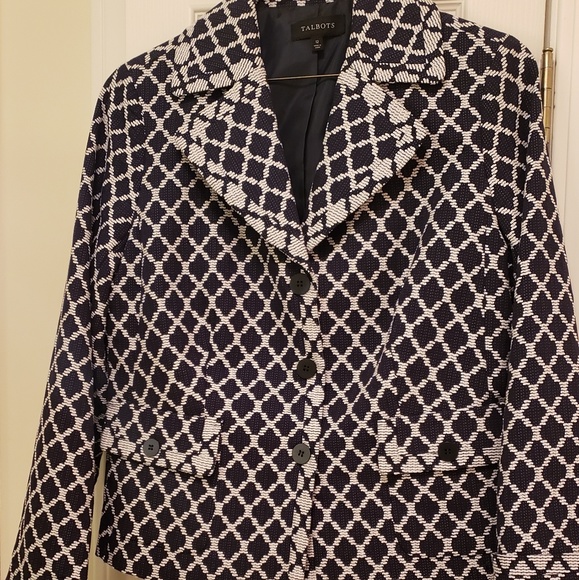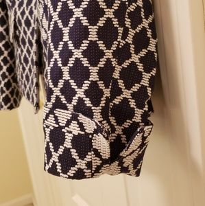 Navy blue and white 100% cotton jacket. This jacket is hip length, real front flap pockets with button closure and turn back sleeve if you prefer bracelet length. Full polyester lining. Excellent condition.