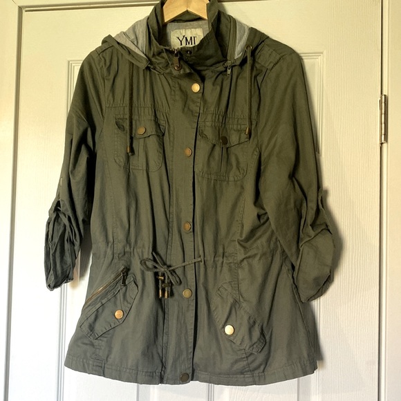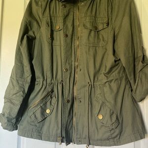 This jacket has a hood but it can also be removed with a zipper. You can zip it up and button it. There is a string around the waste and if you pull it you can make it tighter to give you the hour glass look! Sleeves can be full to your wrist or you can roll them up and button them.