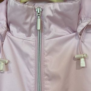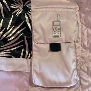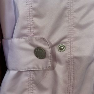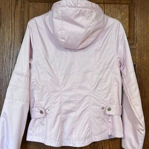 Detachable hood, snazzy silver zipper and lining, front pockets, zip pocket on sleeve, two inside pockets (one for cell phone), snap sides (to cinch in sides/give more a waistline), and snap cuffs.