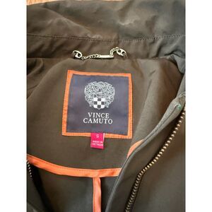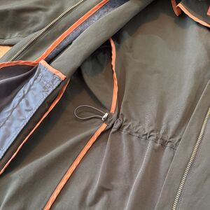 Vince Camuto olive green jacket with orange trim and removable hood. Inner drawstring allows adjustment for a cuter fit at waist. Snap sleeve detail.