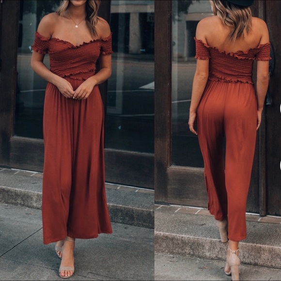 Smocked, off the shoulder romper. Wide, cropped leg. Really flowy and can be dressed up or down