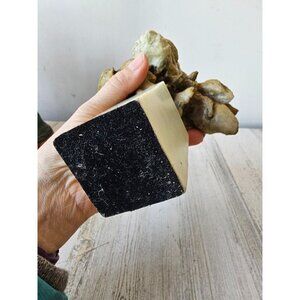 about 10-in tall by 6 in by 6 in, overall good condition, does have a mark on the back, not sure what that is, does it some marks on the base, and feels like resin.