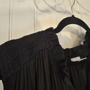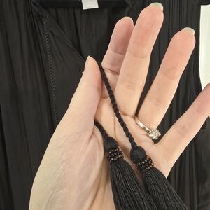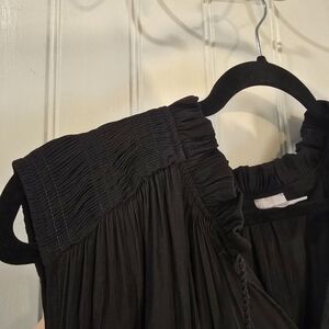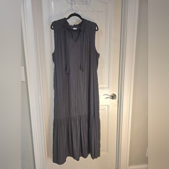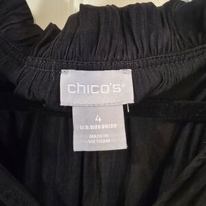 Get spring-ready with this Chico's black sleeveless dress. Bohemian details include tie-neck with beaded tassles, pleated shoulder and neck details, and a ruffled hem. Fully-lined and made with travel friendly fabric. Chico's size 4 equals an 18-20W.
