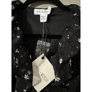 Spring + Mercer women's size small wrap dress.  It is lined and made of polyester. Black and white floral with a touch of shimmer on the petals.  Swiss dot chiffon with a pretty flow.  Wrap style, inner and outer button, fabric tie.  Ruffle around the neckline. Sheer bracelet length sleeves.