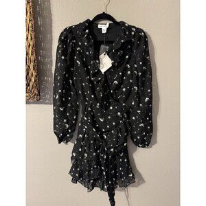 Spring + Mercer women's size small wrap dress. It is lined and made of polyester. Black and white floral with a touch of shimmer on the petals. Swiss dot chiffon with a pretty flow. Wrap style, inner and outer button, fabric tie. Ruffle around the neckline. Sheer bracelet length sleeves.