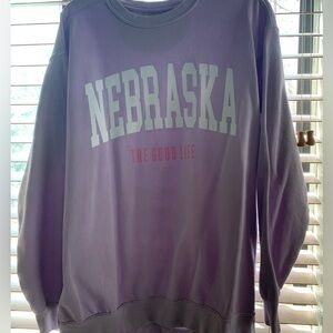 One of a kind Nebraska sweatshirt! The sweatshirt is originally from Four Sisters Boutique in Omaha, Nebraska. The sweatshirt is a light lilac and is made by Comfort Colors (which makes the BEST shirts and sweatshirts). Only worn once but it’s super warm and cozy!
