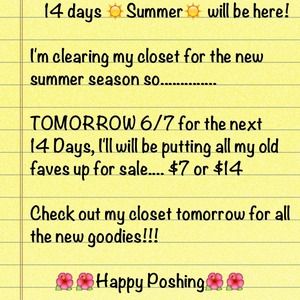 14 days till Summer ☀!!! Crazy $7 & $14 deals. Starting TOMORROW!! Follow Me and my closet till then 😊!!!!!