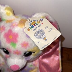 Build-A-Bear floral bunny with soft plush fur. Satin-lined pink ears and embroidered facial features. Multi-colored pastel flower pattern across body. Sweet, huggable design for playtime.