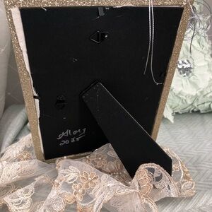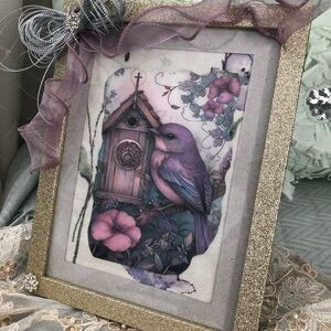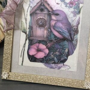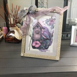 This adorable picture measures 9 1/2 by 7 1/2..the frame has a little bling and is accented with rhinestones ..sparkling silver cord and gauzey ribbon..the frame has a gold cast to it…. Decoupage print on a linen cloth… So pretty.