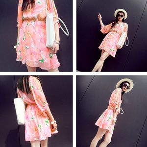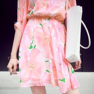 🆕 Spring Pink Chiffon Floral Dress Elastic Waist