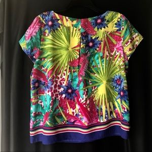 Vibrant cap sleeve top with small inverted pleat at both top and bottom neckline. Will not wrinkle. Completely lined, 100% polyester