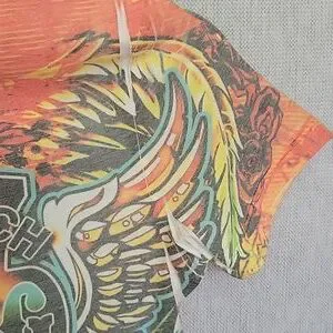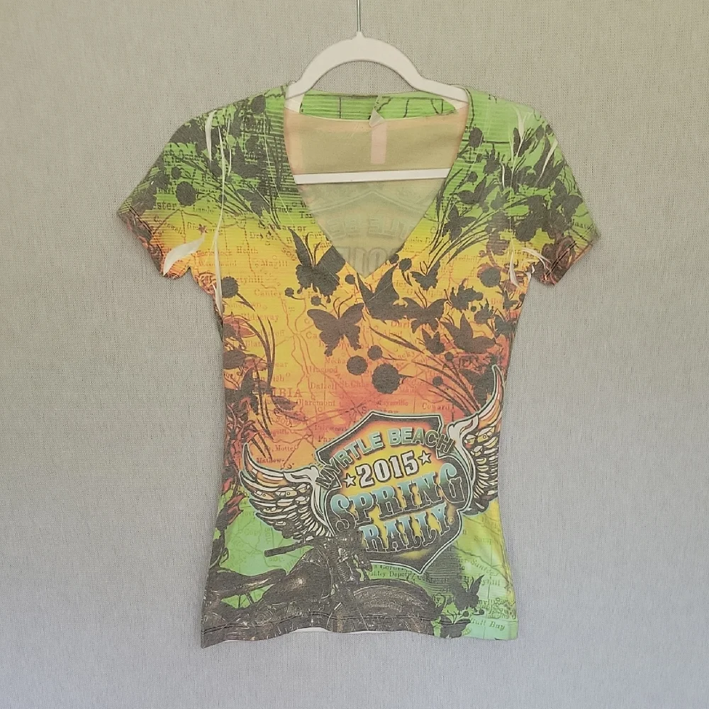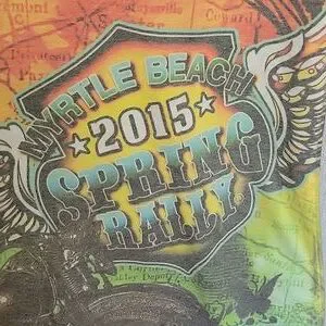 Size Medium Myrtle Beach 2015 Spring Rally biker tee. This image was heat pressed on, so there are some imperfections where the shirt didn't lay flat pictured. Pit to Pit measures 16 inches. Shoulder to Hem measures 26 inches.