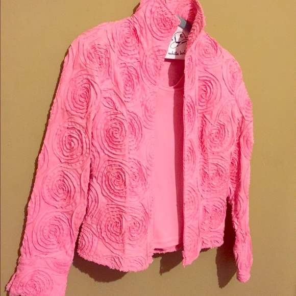 The ultimate in dressing for Spring! Gorgeous pink roses detail the zip jacket. The cami beneath is the exact same shade of pink. I wore this once to Easter Brunch! Huge hit!