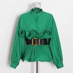 Embrace effortless elegance with this Spring Ruffle Belted Top, a sophisticated piece that combines feminine details with modern tailoring. Delicate ruffles cascade along the long sleeves, while the stand collar and belted waist create a refined, flattering silhouette.