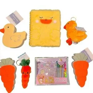 Adorable spring, duck and carrot themed spring set. Includes a fluffy duck notebook, plush duck keychain, carrot sponges/keychain and a Hello Kitty mini stationery set. Perfect for adding fun