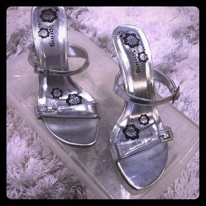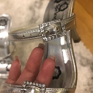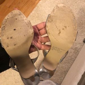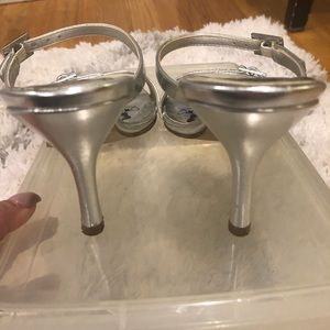 Spring Silver sandals worn once for a wedding. Super comfy 3 1/2 in heel. Missing stones as shown in pic, but you have to look closely.