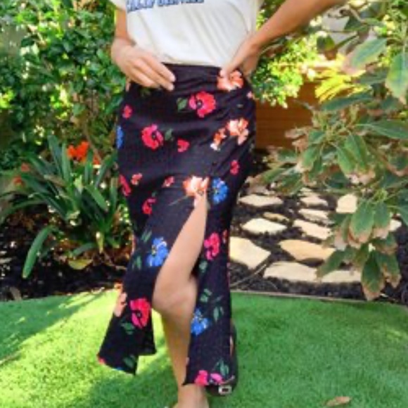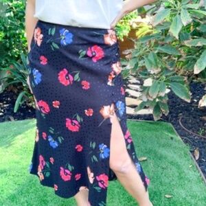 Slip midi skirts could rule the world. They’re comfortable and silk jacquard fabric really steps your causal game up. This monochromatic dot and floral skirt features a back zipper and covered buttons asymmetrically detailing the hips. Runs a little big. Ali seen wearing a small.
