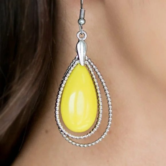 A sunny yellow teardrop bead attaches to a studded silver frame. The colorful frame swings from the top of a matching studded teardrop, creating an airy double lure for a seasonal look. Earring attaches to a standard fishhook fitting.
