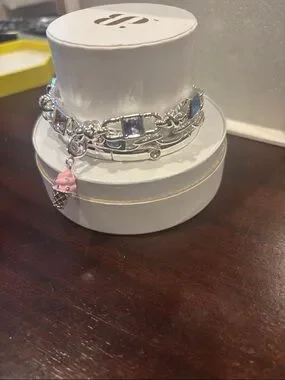 Delicate silver-tone bracelet featuring colorful crystal accents and a playful pink ice cream charm. Subtle sparkle from multi-colored stones adds fun and personality. Lightweight and versatile for everyday wear. A charming addition to any jewelry collection featuring pink highlights.