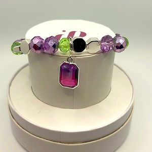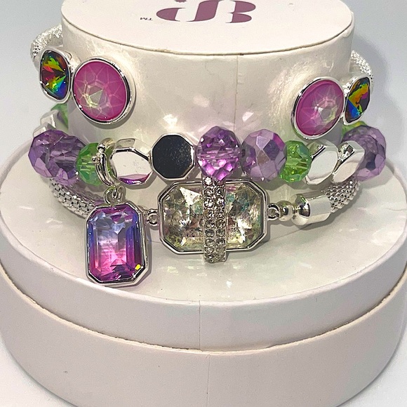 “Sparkling Confidence” in our 2024 spring stacks BP collection. Stunning three piece bracelets, one of those is a cuff with our purple and rainbow stones.