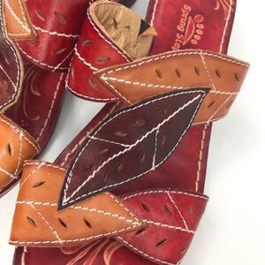 Spring Step AZALEA Red Brown Laser Cut Leaf Whimsical Wedge Heel Open Toe Sandals